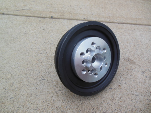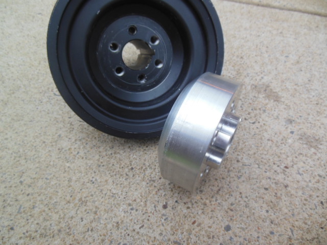 Ill try to upload pics of the drive adapter I had one of my friends make for me.. Its a Powerbond steel damper with 4 xtra holes drilled on bolt circle of existing pair of bolt holes 6 total with allen bolts .made OD snug fit in damper . uses 2" pilot for pulley. Currently have pulley for 2" Gilmer belt but might end up with a pair of V-belts. ill make the pulleys.. Ihave very little room in front of engine. Tranny too big to move /engine back any more without lots of work.. Steve McD