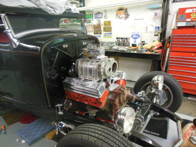 Heres the intake & blower mockup . The blower project will be on side shelf til I get headers made.. The blower is low enough for hood clearance and im trying to keep headers inside louvered hood sides.. Its tight fit .. Short block parts were purchased with blower in mind.. I may assemble with hi comp heads & 3x2s for this summer .Change heads in fall and the rest is already done. Regards Steve McD