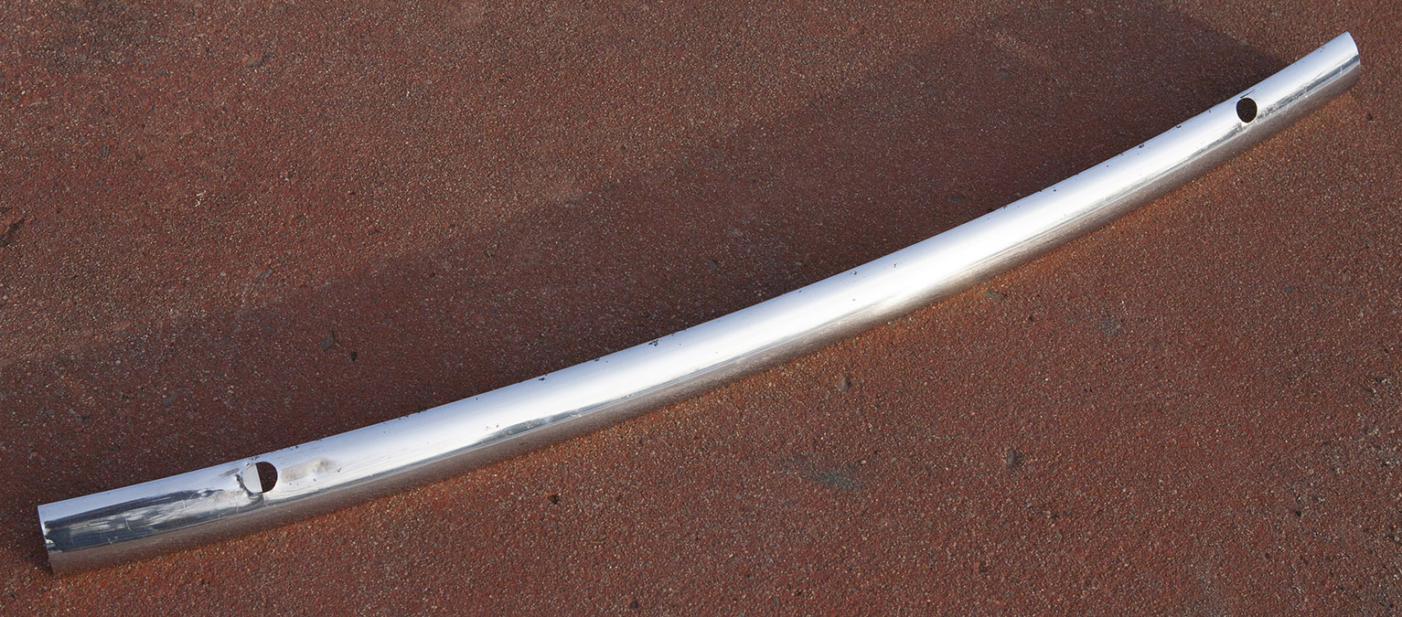 The piece is used. The overall piece is smooth and has retained the smooth arc. It is not warped or bent. This could be put on a driver car but could be restored and polished to show quality. It also has the mounting clips.