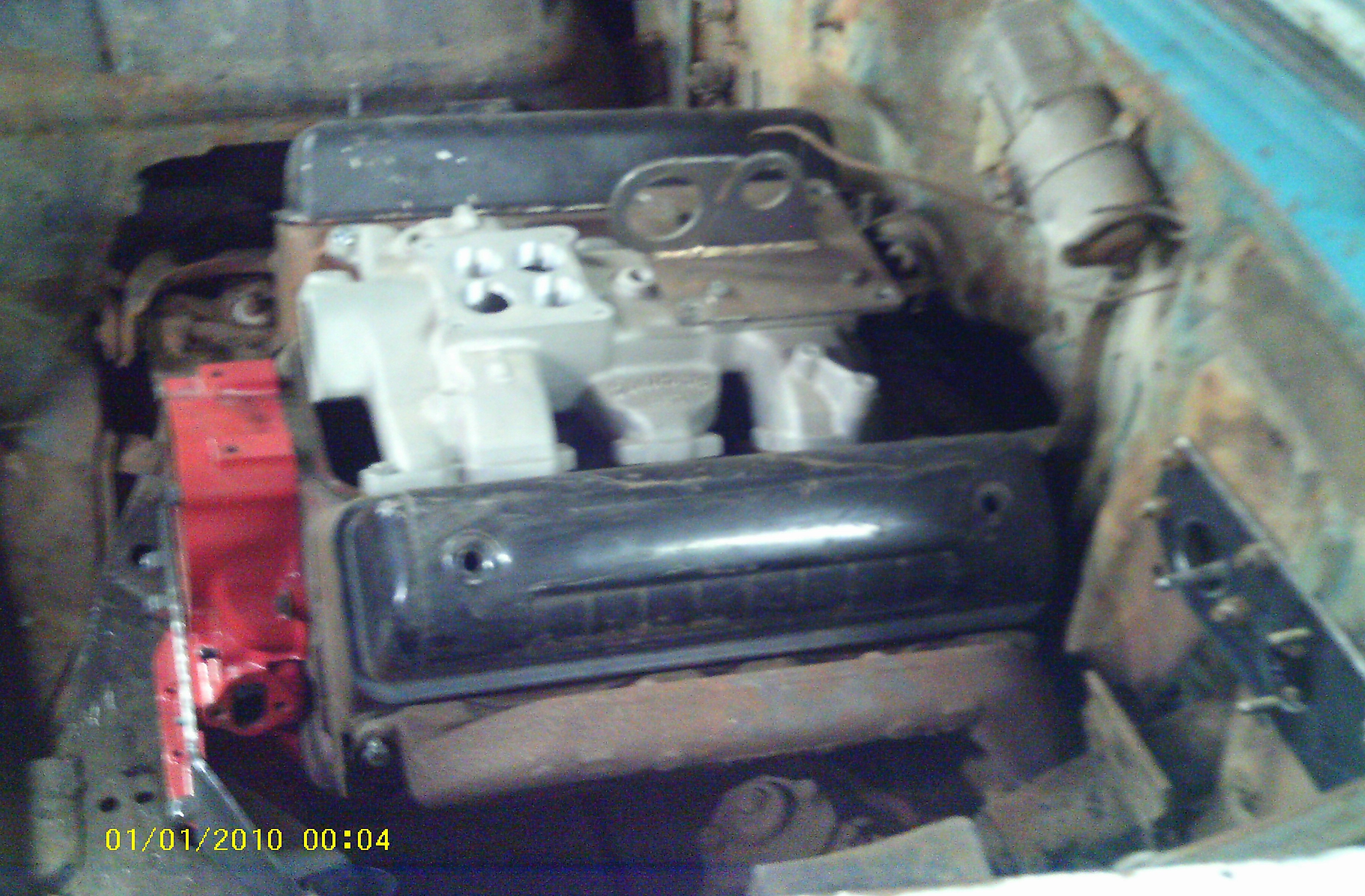 I'm not sure if this is the right section for this, but I finally got started on my engine conversion on my 1956 ----. The engine fit surprisingly well. We fabricated a front mount and used a transmission crossmember from an '88 Ford Crown Victoria, narrowed it considerably, and welded brackets to the inside of the frame to attach it to. We fab'd a bracket on the firewall next to the brake cylinder for a hydraulic clutch cylinder. As you can see by the photo, the exhaust manifold clears the steering gear. On passenger side, we massaged the firewall about a half inch rearward to clear the passenger manifold. We will be using a T-Bird oil pan to clear the steering linkage. It appears to have adequate fan to radiator clearance. Will be using a top loader 4-speed and a Dana 44 rear axle from a '55 Ford station wagon. It will take awhile to finish the car as you can see, it is ugly, but should get a lot of looks when finished.