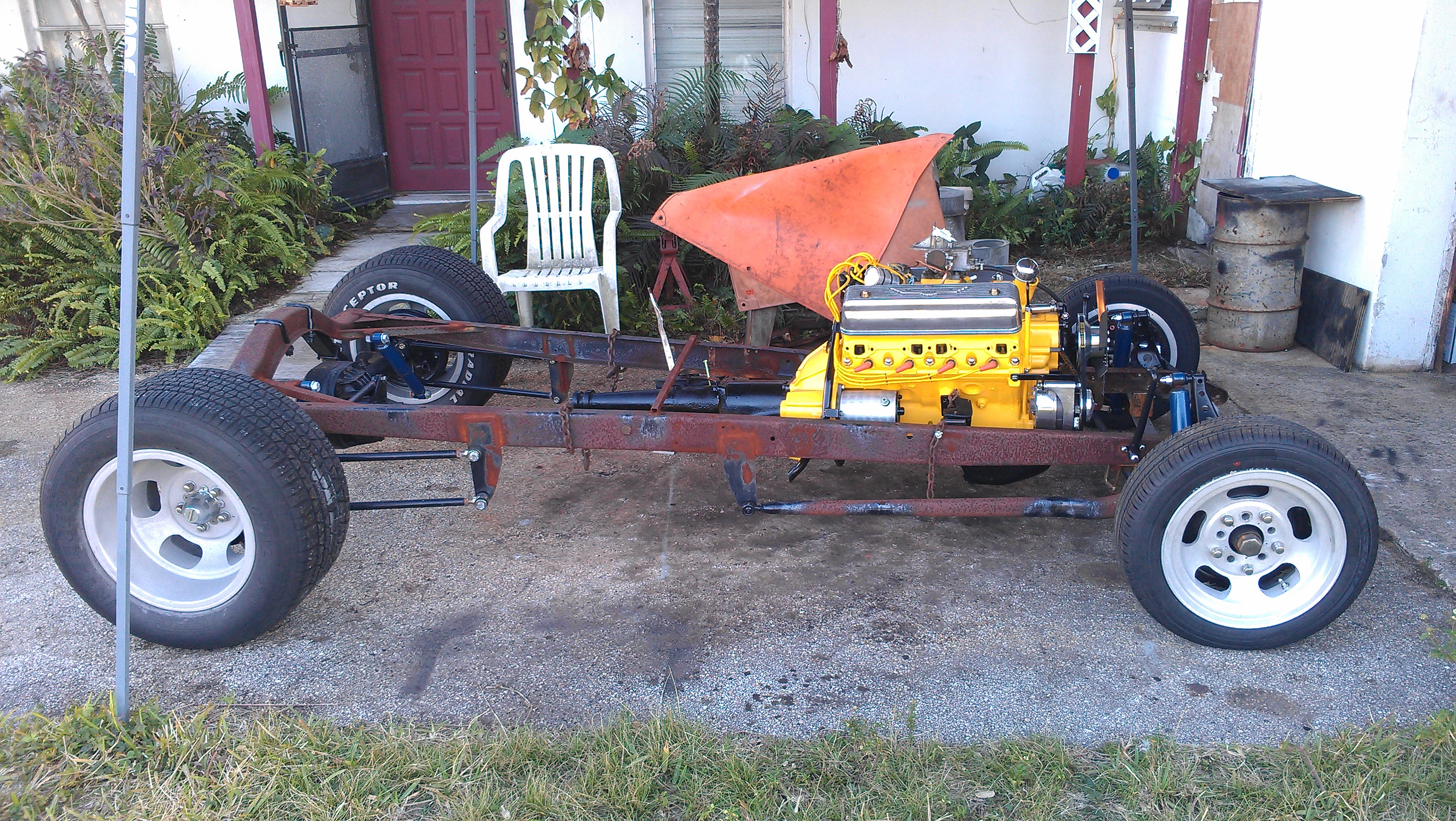 I built my Y-bock power 28 modal A in 1959 for highschool,I took her apart in 1965 when I got my own house and wife,sold off a few parts and stored the rest in the garage and out back,just never got back to rebuilting tell a few years ago,too many racecars and other rods , so now finiely had to hunt replacement parts for those I sold [did't wish to start the rebuild tell I had most of missing parts..Funny how those parts didn't seem a big deal then,but hunting them back up has been a trip,took 3years to find my headlites,I didn't know then they were oneyear only type just b4 ww2 made aftermarket sealbeams bass buckets w/ss rims. I post update as I go from time to time,I desided to use a 65 Mustang rear end with 4bars this time, cuz I sold off the 49 OLDs one that had like truckarm sub. A good buddy gave me some alum slots,so I'll be using them vs my steely. Turn out the rad is roted out,so I got a new alum one. I'll be off finding a new driveshaft u-jiont today to link to the mustang rear.