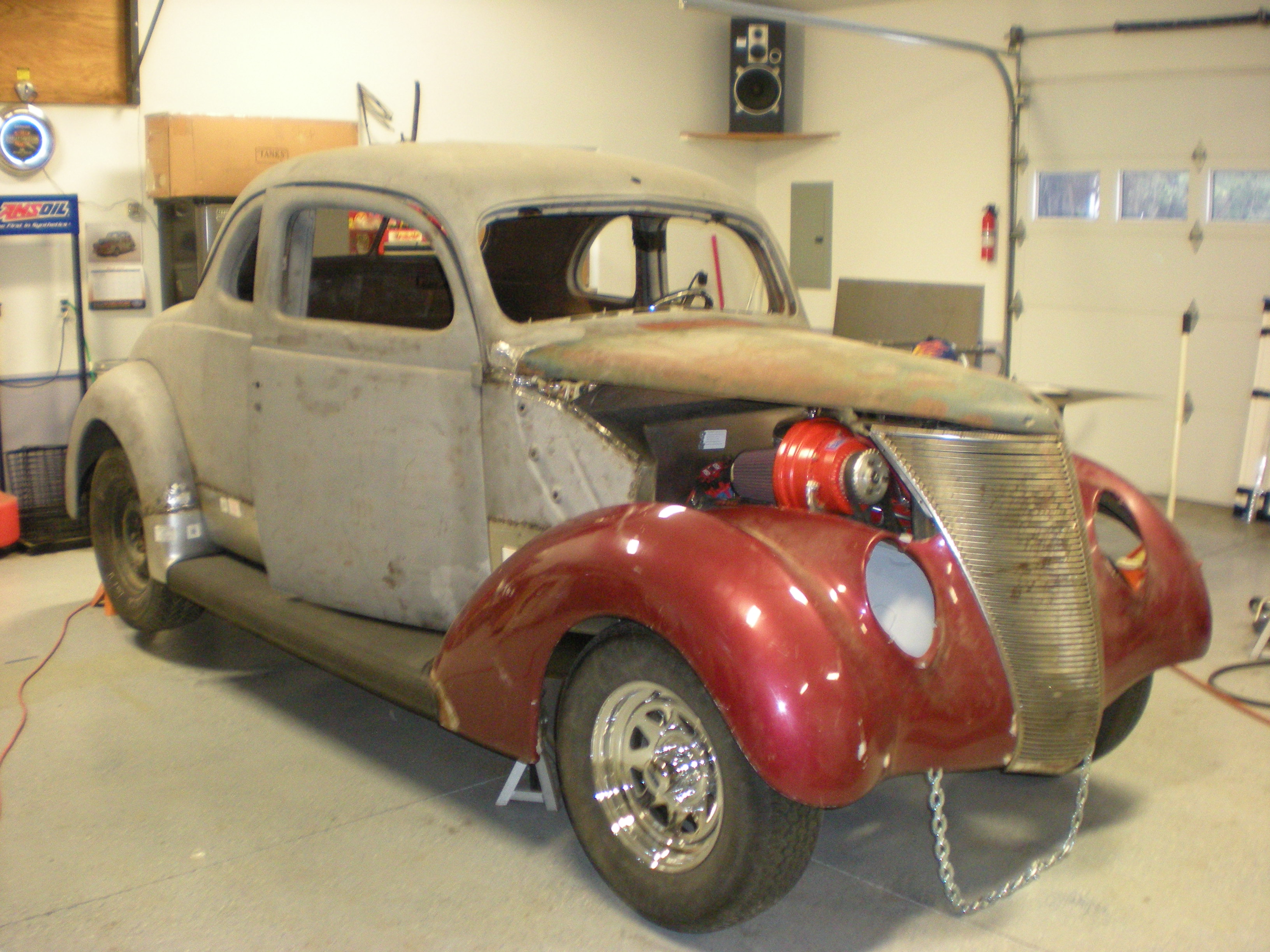 Well, the coupe is ready to travel. It's just pieced together and roughly mocked-up, but it shouldn't fall apart on the 3,000+ mile trip. I'll be hauling it myself with my 08 Tundra on an aluminum car hauler, "Big Al" (short for "Aluminum"). Just need to finish packing it with parts, load it on Big Al , get it shrink wrapped and wait until the house sells. My wife and my 56 are already in Bishop, but with quite a bit of snow on the ground here, it may be a few weeks before folks even start house hunting. I still can't upload images like I used to, but was able to attach a file picture.
